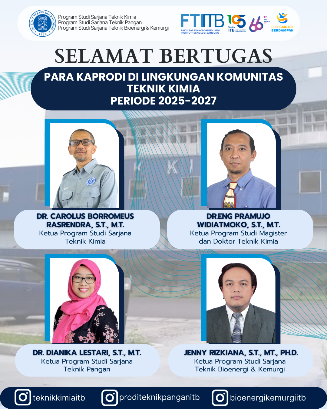 🌟 Selamat Bertugas! 🌟 Kami mengucapkan selamat dan sukses kepada para Ketua Program Studi di lingkungan komunitas Teknik Kimia ITB periode 2025–2027: • Dr. Carolus