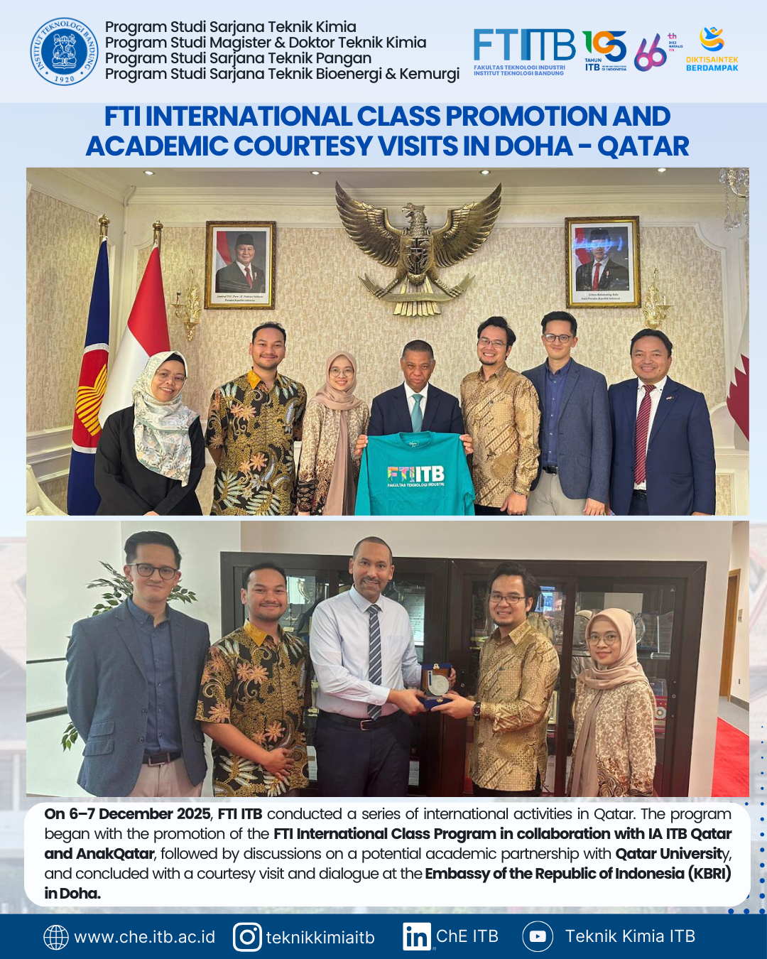 Fakultas Teknologi Industri (FTI), Institut Teknologi Bandung (ITB), melaksanakan serangkaian kegiatan keterlibatan internasional di Doha, Qatar, pada 5–6 Desember 2025, sebagai bagian dari upaya memperkuat kolaborasi internasional dan mempromosikan program