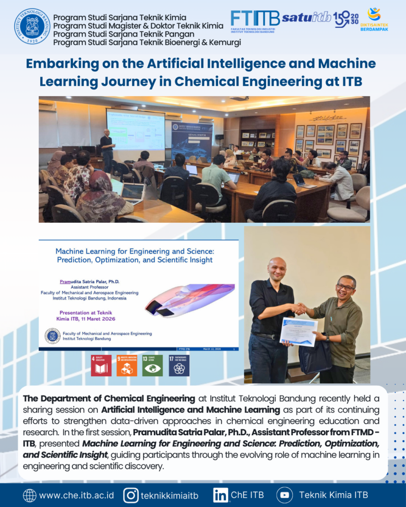 Departemen Teknik Kimia Institut Teknologi Bandung baru-baru ini menyelenggarakan sesi berbagi mengenai Artificial Intelligence (AI) dan Machine Learning (ML) sebagai