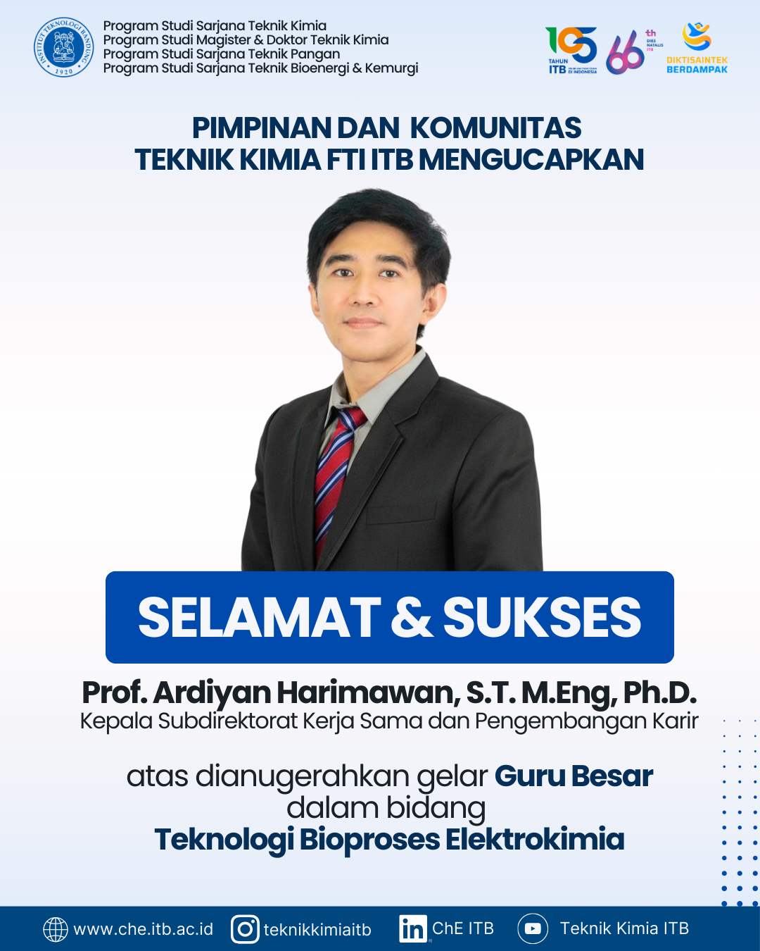 Selamat dan sukses kami sampaikan kepada Prof. Ardiyan Harimawan, S.T., M.Eng., Ph.D. atas penganugerahan gelar Guru Besar dalam bidang Teknologi Bioproses Elektrokimia. Penganugerahan ini menjadi