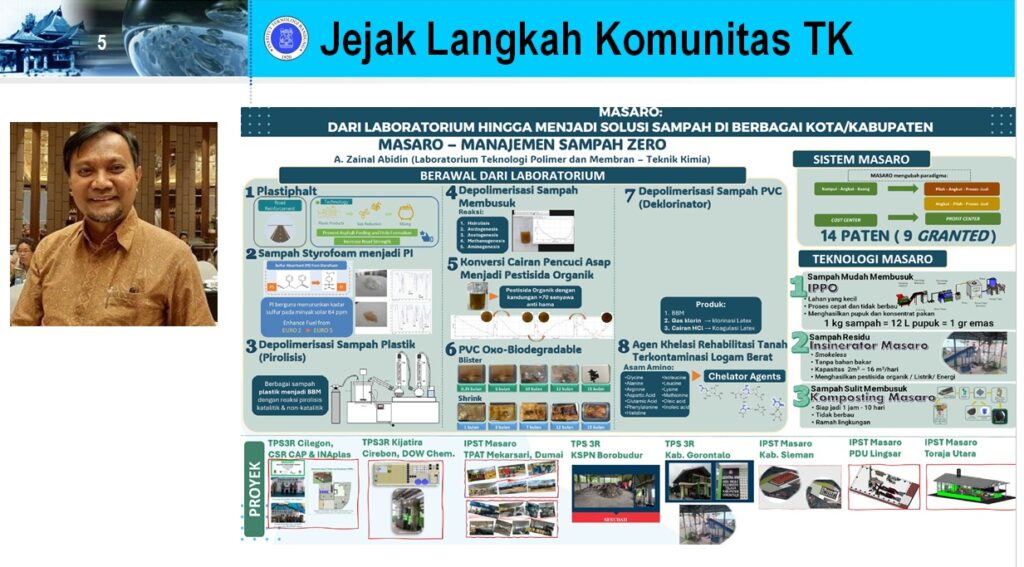Salah satu warisan yang paling dikenal luas oleh publik adalah lahirnya Teknologi MASARO (Manajemen Sampah Zero). Berangkat dari riset skala laboratorium, beliau merancang sistem pengolahan sampah terpadu yang memadukan teknologi  depolimerisasi, pengolahan residu, dan konversi sampah organik menjadi pupuk/pakan. Inisiatif ini tidak sekadar konsep, melainkan tumbuh menjadi gerakan dan unit-unit implementasi di berbagai kota/kabupaten, sekaligus menegaskan keyakinan beliau bahwa riset harus hadir sebagai solusi nyata bagi persoalan bangsa. Perjalanan inovasi MASARO juga melahirkan belasan paten/HAKI di bidang pengolahan sampah, teknologi polimer, dan produk turunannya, yang sebagian telah memperoleh status granted, serta menjadi landasan pendirian ekosistem industri pengolahan sampah MASARO.