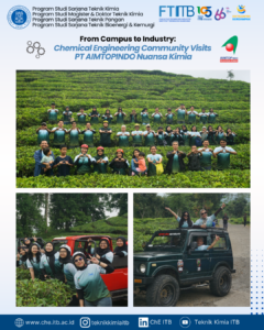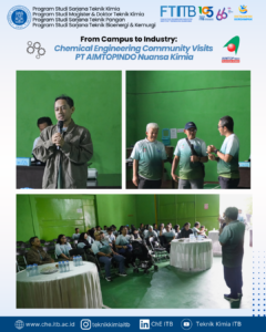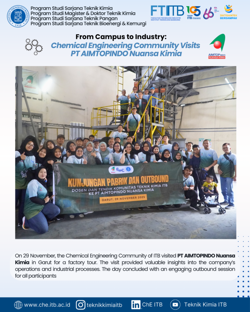Pada tanggal 29 November 2025, tenaga pendidik dari Komunitas Teknik Kimia ITB melaksanakan kunjungan industri ke PT Aimtopindo Nuansa Kimia di Garut. Kegiatan ini memberikan pengalaman berharga dalam memperoleh pemahaman langsung mengenai proses operasional dan produksi di industri kimia.